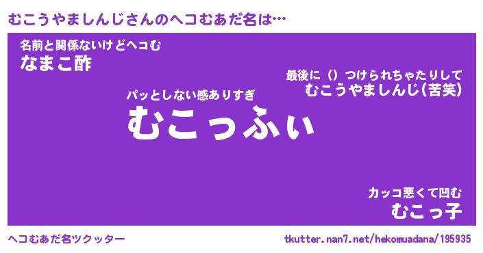 | 男性向けラノベタイトル風あだ名 | 『むこうやましんじの憂鬱』 |