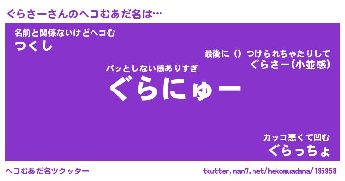 | 意味不明あだ名 | 『ペロリンぐらさー』『永久保存ぐらさー』 |