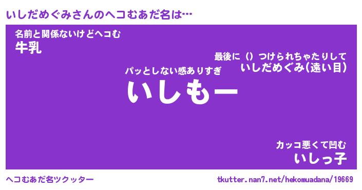 | ヒーロー風カッコイイあだ名 | 『スーパーイシダメグミ』『黄金騎士イシ』 |