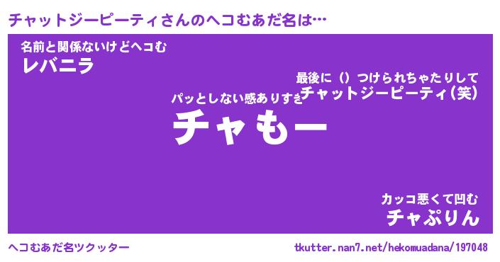 | 意味不明あだ名 | 『ペロリンチャットジーピーティ』 |
