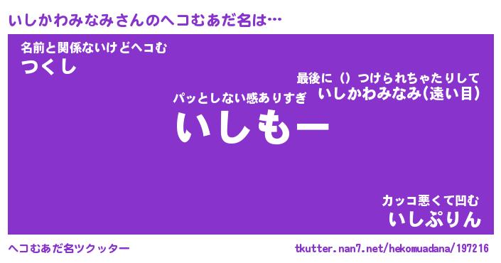 | 恥ずかしいあだ名 | 『プリティーいしかわみなみ』『いしちん』 |