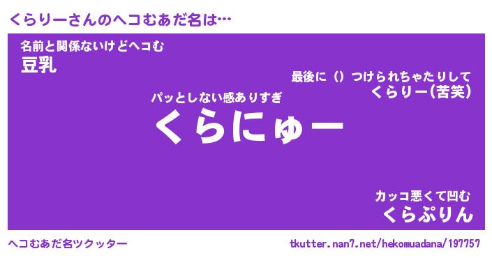 | 意味不明あだ名 | 『ペロリンくらりー』『永久保存くらりー』 |