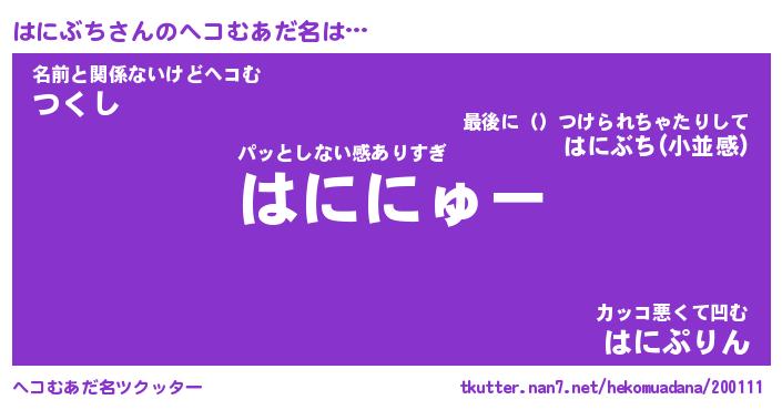 | ピコ太郎風あだ名 | 『ハコ史郎』『ピハ六郎』『ハニ十郎』 |
