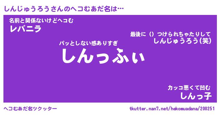 | 男性向けラノベタイトル風あだ名 | 『しんじゅうろうの憂鬱』 |
