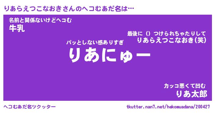 | 欧米人風あだ名 | 『マイケルりあらえつこなおき』 |
