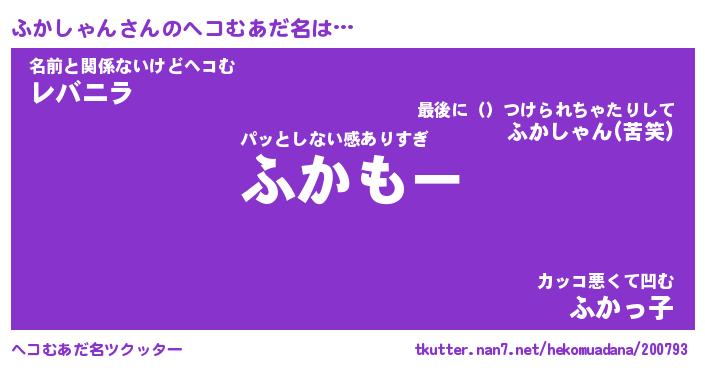 | 男性向けラノベタイトル風あだ名 | 『ふかしゃんの憂鬱』 |