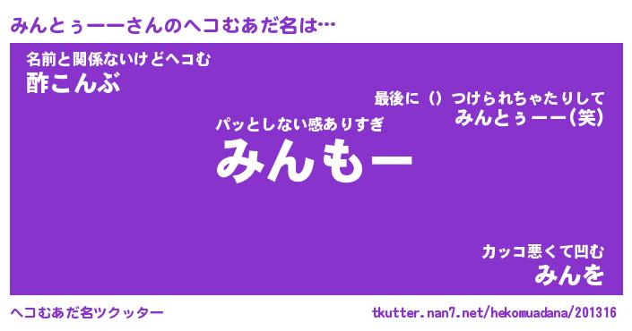 | 男性向けラノベタイトル風あだ名 | 『みんとぅーーの憂鬱』 |