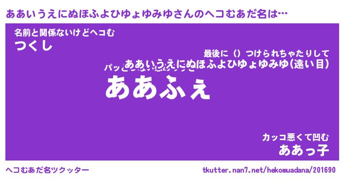 | 男性向けラノベタイトル風あだ名 | 『ああいうえにぬほふよひゆょゆみゆの憂鬱』 |