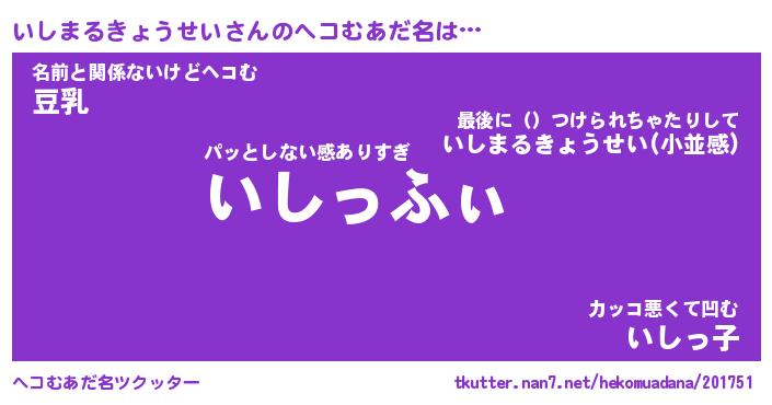 | ピコ太郎風あだ名 | 『イコ十郎』『ピイ五郎』『イシ太郎』 |