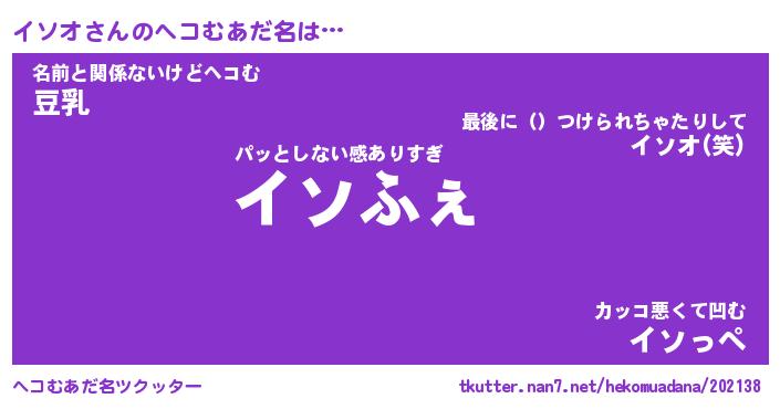 | 意味不明あだ名 | 『ペロリンイソオ』『イソオフォーエバー』 |
