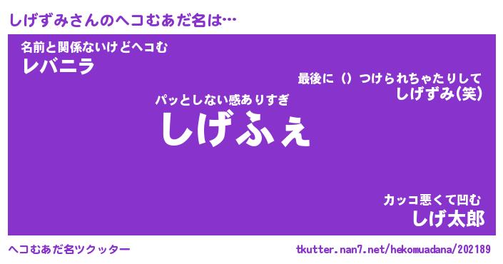 | 意味不明あだ名 | 『ペロリンしげずみ』『永久保存しげずみ』 |