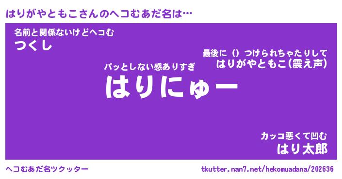 | ツイッター | はりがやともこさんのツイッターID『renkon_idle』 |