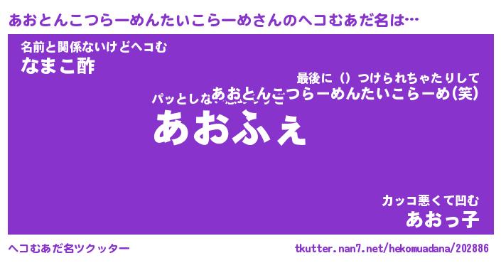 | 男性向けラノベタイトル風あだ名 | 『あおとんこつらーめんたいこらーめの憂鬱』 |
