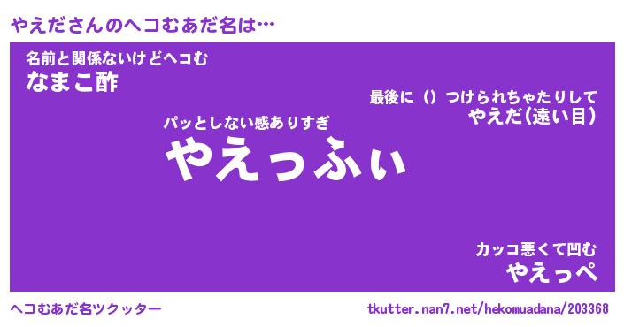 | ピコ太郎風あだ名 | 『ヤコ八郎』『ピヤ太郎』『ヤエ十郎』 |