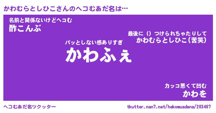 | 女子向けラノベタイトル風あだ名 | 『かわむらとしひこ姫と円卓の騎士』 |