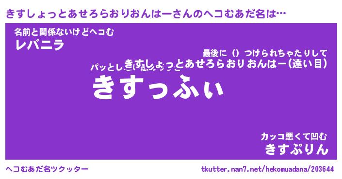 | 欧米人風あだ名 | 『マイケルきすしょっとあせろらおりおんはー』 |