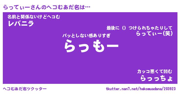 | 男性向けラノベタイトル風あだ名 | 『らってぃーの憂鬱』 |