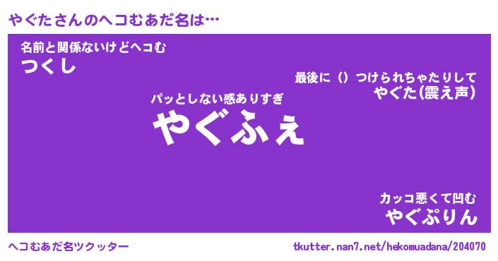 | 2回繰り返すあだ名 | 『やぐやぐ』『ややぐぐ』『くだくだ』 |