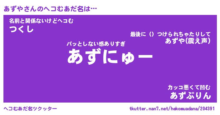 | 意味不明あだ名 | 『ペロリンあずや』『あずやフォーエバー』 |