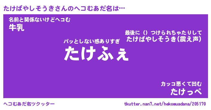 | 2回繰り返すあだ名 | 『たけたけ』『たたけけ』『いらいら』 |