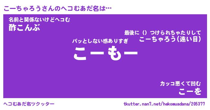 | 男性向けラノベタイトル風あだ名 | 『こーちゃろうの憂鬱』 |