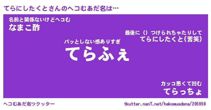 | 欧米人風あだ名 | 『マイケルてらにしたくと』 |