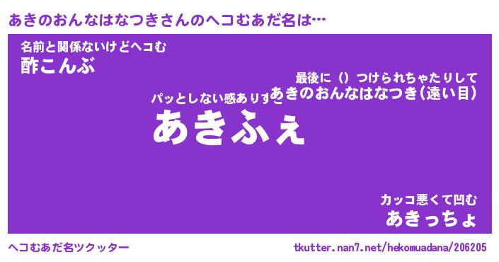| 男性向けラノベタイトル風あだ名 | 『あきのおんなはなつきの憂鬱』 |