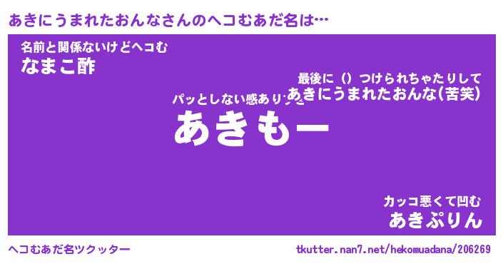 | 男性向けラノベタイトル風あだ名 | 『あきにうまれたおんなの憂鬱』 |