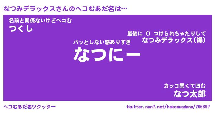 | 男性向けラノベタイトル風あだ名 | 『なつみデラックスの憂鬱』 |