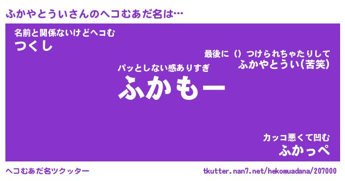 | ヒーロー風カッコイイあだ名 | 『スーパーフカヤトウイ』『黄金騎士フカ』 |