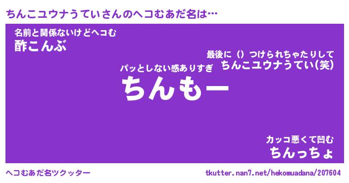 | 男性向けラノベタイトル風あだ名 | 『ちんこユウナうていの憂鬱』 |