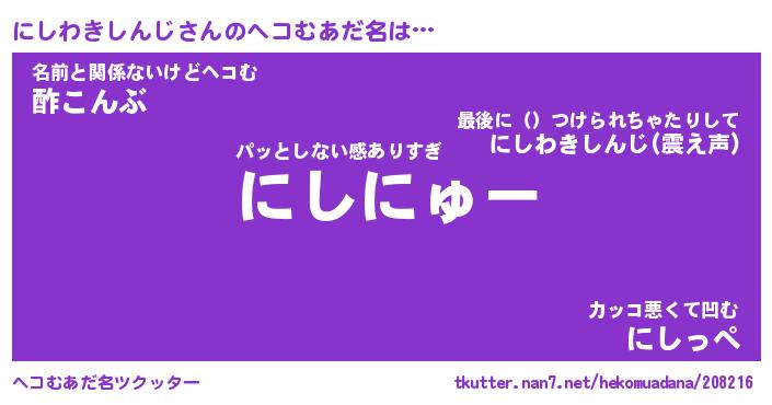 | 恥ずかしいあだ名 | 『プリティーにしわきしんじ』『にしちん』 |