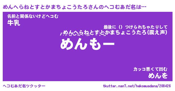 | 胡散臭い通販商品みたいなあだ名 | 『モテモテ間違いなし霊験あらたかなお札…その名も「めんへらねとすとかまちょこうたろ」』 |