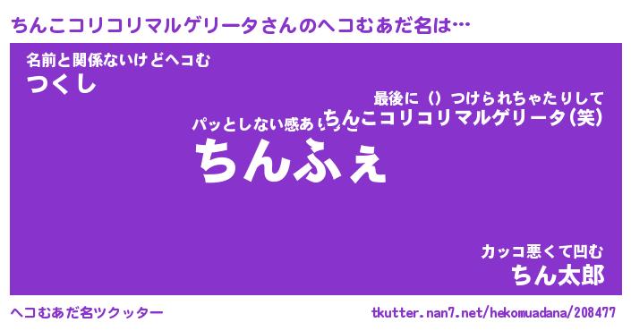 | 男性向けラノベタイトル風あだ名 | 『ちんこコリコリマルゲリータの憂鬱』 |