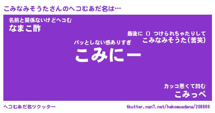 | 恥ずかしいあだ名 | 『プリティーこみなみそうた』『こみちん』 |