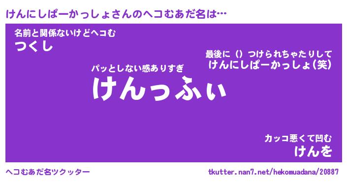 | 男性向けラノベタイトル風あだ名 | 『けんにしぱーかっしょの憂鬱』 |