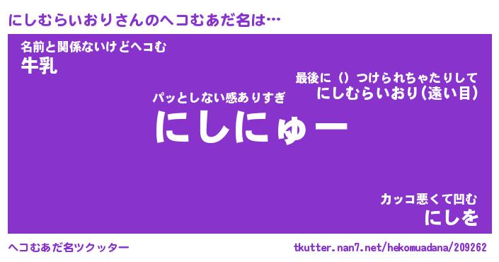 | 恥ずかしいあだ名 | 『プリティーにしむらいおり』『にしちん』 |