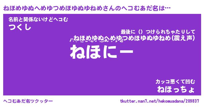 | 料理風あだ名 | 『ネギたっぷりねほめゆぬへめゆつめほゆぬゆねめの南蛮漬け』 |