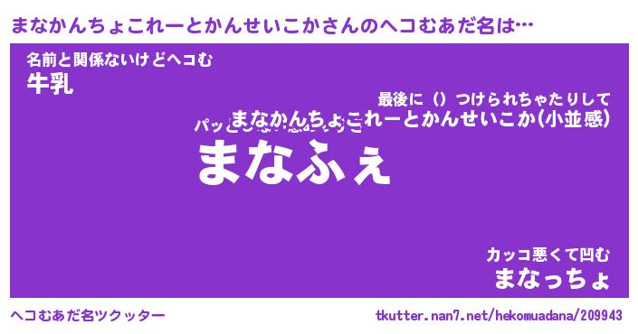 | 胡散臭い通販商品みたいなあだ名 | 『億万長者になれる水晶球…その名も「まなかんちょこれーとかんせいこか」』 |