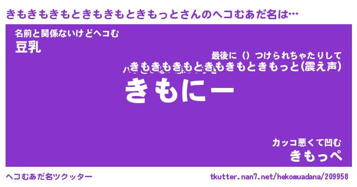 | 男性向けラノベタイトル風あだ名 | 『きもきもきもときもきもときもっとの憂鬱』 |