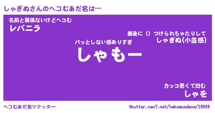 | 男性向けラノベタイトル風あだ名 | 『しゃぎぬの憂鬱』 |