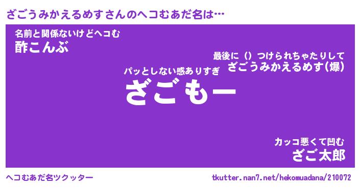 | 男性向けラノベタイトル風あだ名 | 『ザゴウミカエルメスアートオンライン』 |