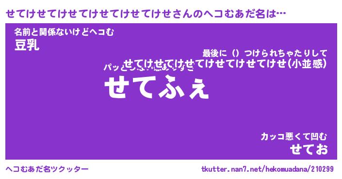 | 男性向けラノベタイトル風あだ名 | 『せてけせてけせてけせてけせてけせの憂鬱』 |