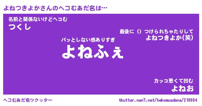 | 男性向けラノベタイトル風あだ名 | 『よねつきよかの憂鬱』 |