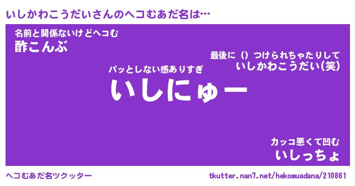 | 男性向けラノベタイトル風あだ名 | 『いしかわこうだいの憂鬱』 |