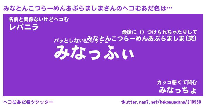 | 男性向けラノベタイトル風あだ名 | 『ミナトンコツラーメンアブラマシマアートオンライン』 |