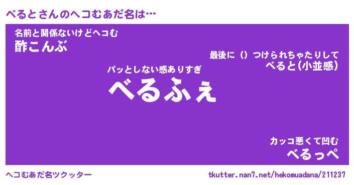 | 意味不明あだ名 | 『ペロリンべると』『べるとフォーエバー』 |