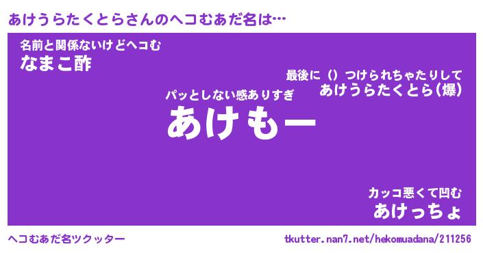 | 男性向けラノベタイトル風あだ名 | 『あけうらたくとらの憂鬱』 |