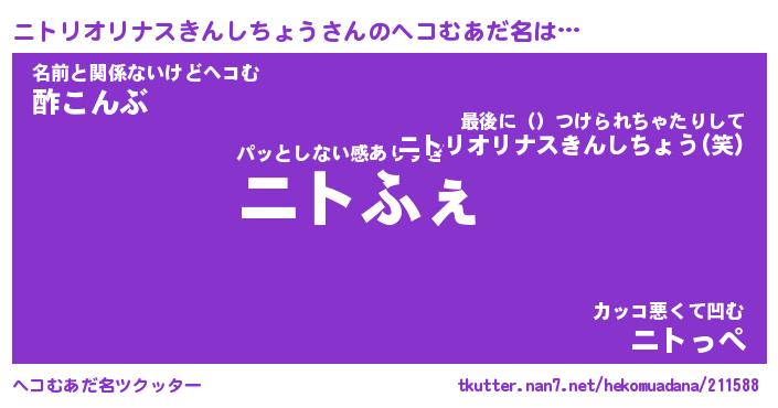 | 男性向けラノベタイトル風あだ名 | 『ニトリオリナスキンシチョウアートオンライン』 |