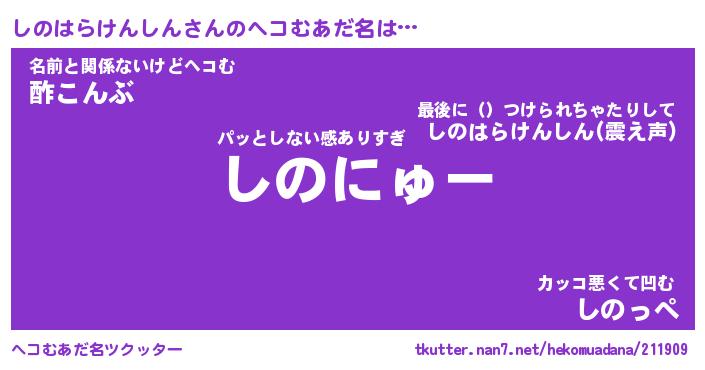| 男性向けラノベタイトル風あだ名 | 『しのはらけんしんの憂鬱』 |